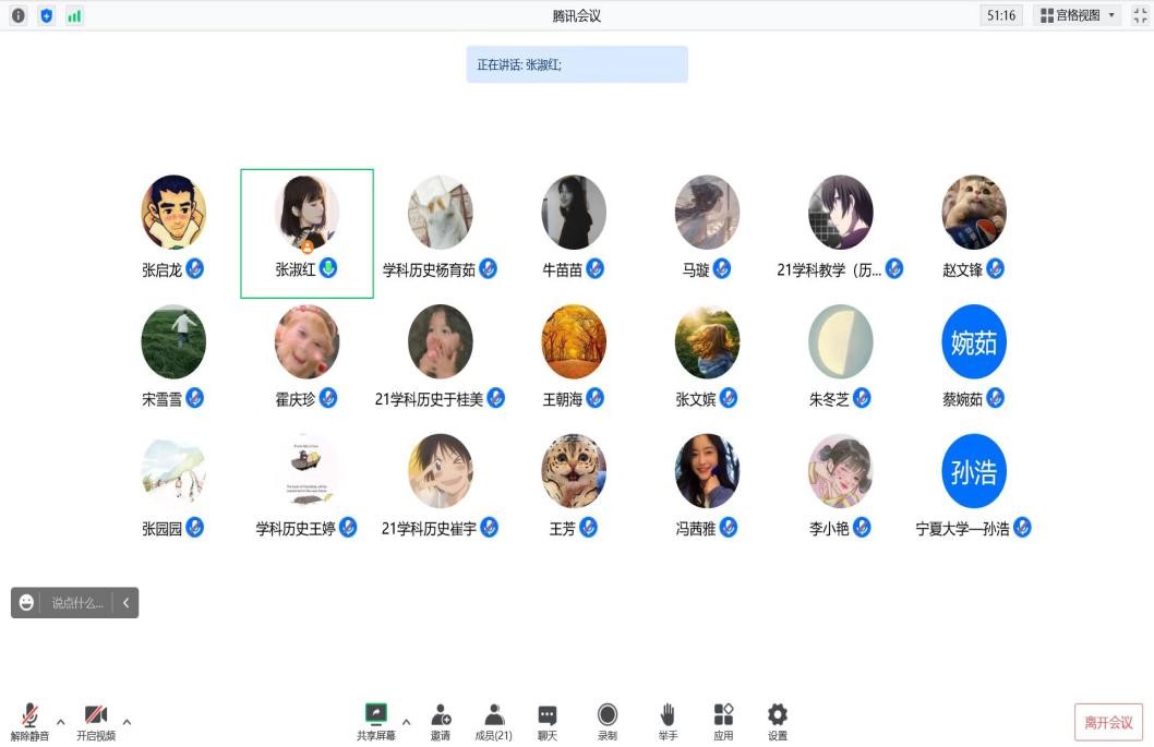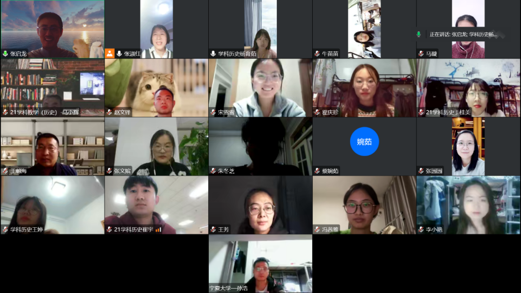 21级学科教学(历史)专业的研究生以线上会议的形式开展了中期考核汇报会议。本次会议由张淑红老师主持,参会老师有王朝海、张园园和张启龙几位导师。21级学科教学(历史)专业的17位同学先后进行了汇报。