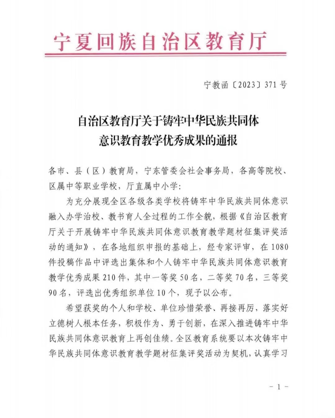近日,自治区教育厅发布了《关于铸牢中华民族共同体意识教育教学优秀成果的通报》(宁教函〔2023〕371号),对全区各级各类学校铸牢中华民族共同体意识教育教学题材征集评奖活动结果公布,由华人影院