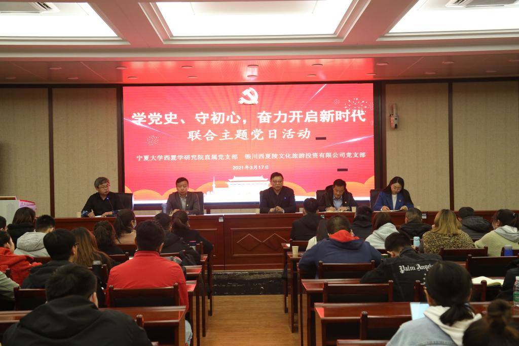 为深入学习践行习近平总书记在党史学习教育动员大会上的重要讲话精神,扎实做好党史学习教育,使党员通过重温中国共产党带领全国各族人民奋斗的百年光辉历程,激励广大党员从历史中汲取前进的力量,增强干事创业的信心和动力,以优异成绩迎接建党一百周年,西夏学研究院直属党支部与教学科研实践基地银川西夏陵文投公司党支部于3月17日在我校怀远校区逸夫楼报告厅联合开展了“学党史,守初心,奋力开启新征程”主题党日活动。