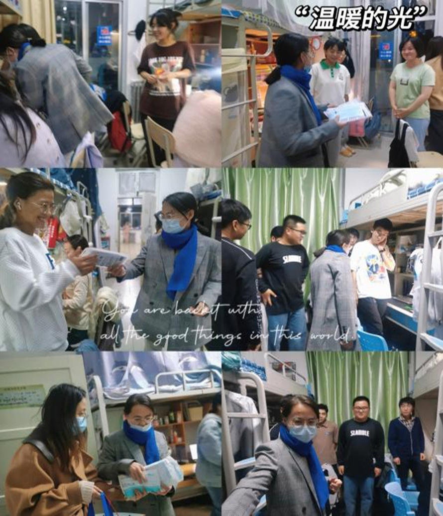 党委副书记刘翔未、学院办公室刘菲老师深入学生宿舍,了解学生思想动态、倾听学生心声,并为学生发放防疫物资,确保学生能够获得及时、有效的暖心关爱和防疫保障。