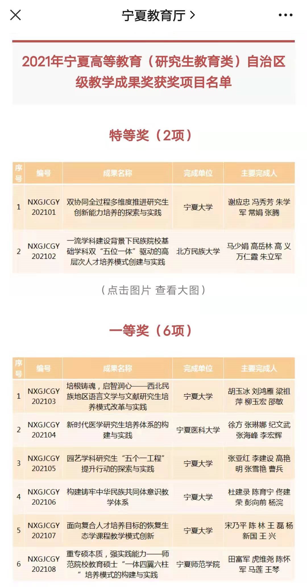 近日,自治区教育厅公布2021年高等教育自治区级教学成果奖名单。共评选出本科教育类特等奖5项、一等奖15项、二等奖30项;研究生教育类特等奖2项、一等奖6项、二等奖12项。由华人影院 杜建录教授团队申报的《构建铸牢中华民族共同体意识教育体系》荣获研究生教育类一等奖。