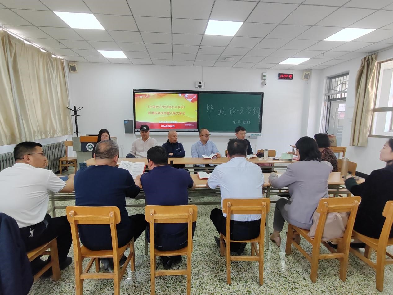 为深入学习贯彻新修订的《中国共产党纪律处分条例》,带动教师党员进一步强化纪律意识,加强自我管理和约束,提高政治免疫力,5月8日下午,历史系教工党支部在兰山一教C504教室以党纪学习教育学习班的形式对《中国共产党纪律处分条例》新增或修改的重点条文进行了学习和交流。
